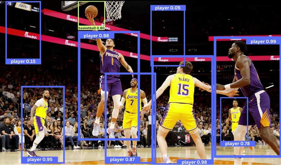 Utilizing over 3,000 labeled images, Ayush Pai has trained a machine learning model called YOLO (You Only Look Once) to detect basketballs of all shades in various levels of lighting. This model also detects players in the image and differentiates them from fans, disregarding boxes with low confidence scores (such as player detections 0.05 and 0.15 below).