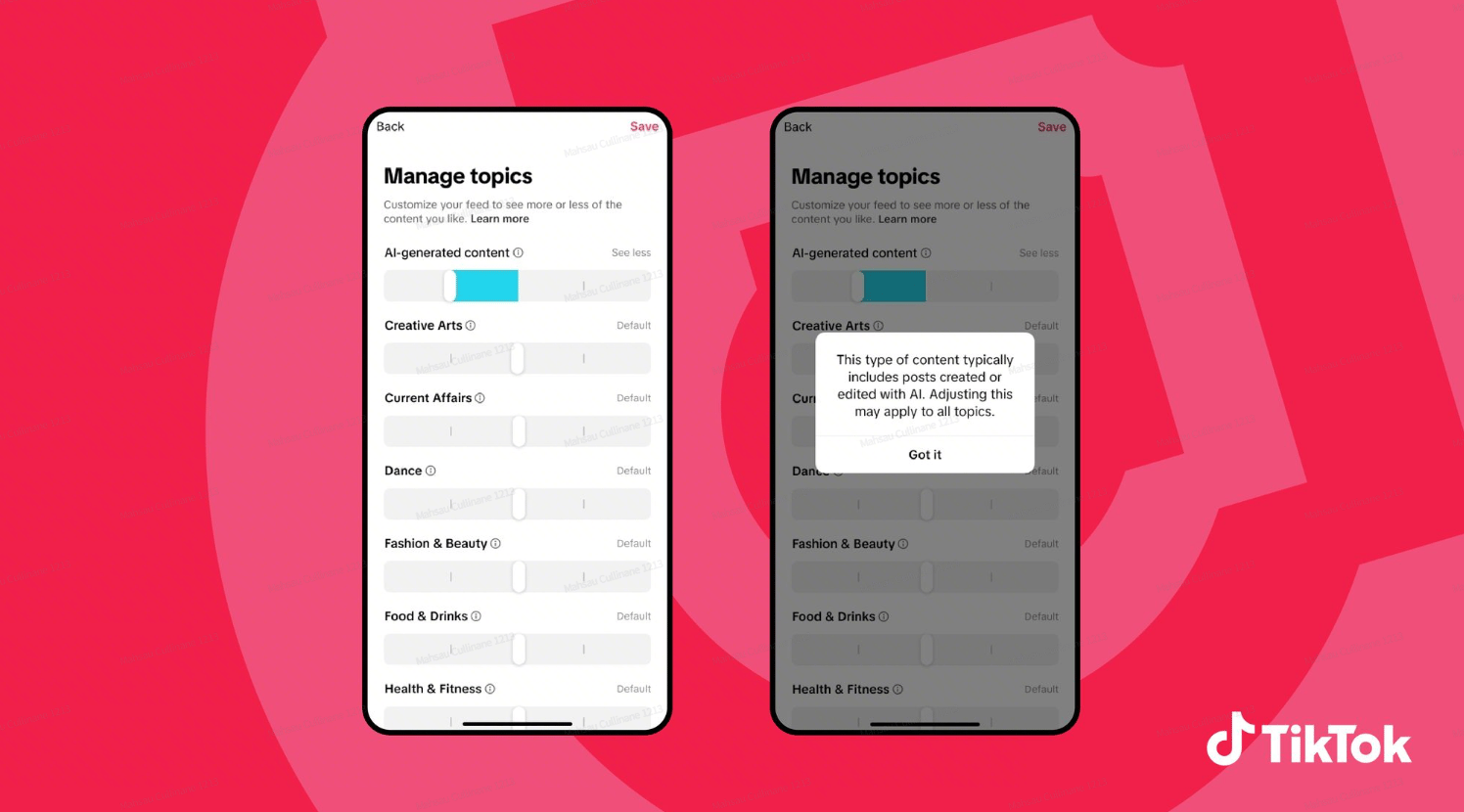 What’s up? In the coming weeks, TikTok will pilot a “Manage Topics” slider that allows users to increase or decrease the amount of AI-generated content they see.